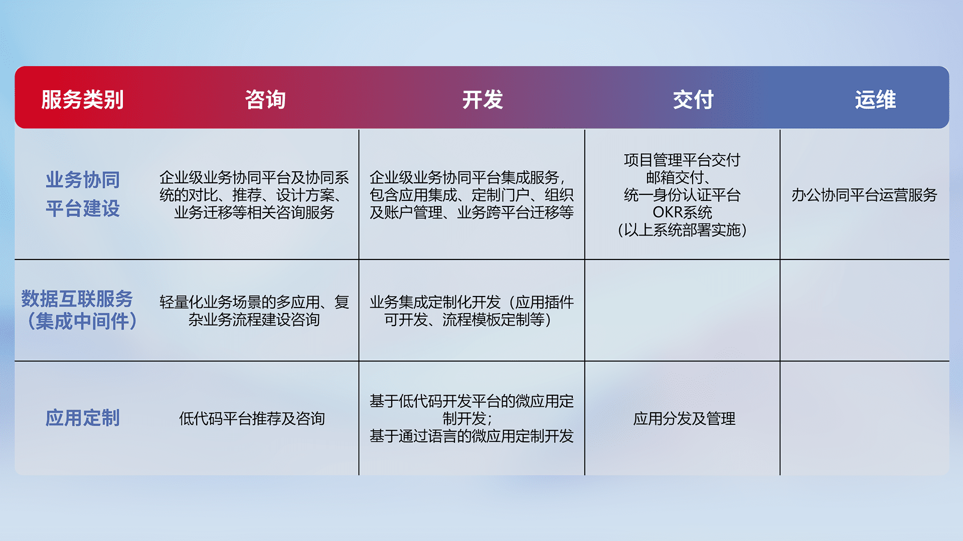 针对钉钉、、、企微、、、IDaas等平台级产品提供产品的规划、、、方案、、交付、、、、定制化开发等服务,,实现如统一协同办公、、、智能客户服务、、混合会议管理、、、、智能数据查询、、、等业务场景,,,,实现数字化转型。。。。